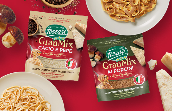 Da sempre, Ferrari Formaggi seleziona con cura materie prime di eccellenza per offrire prodotti che uniscono tradizione e innovazione. La linea GranMix è pensata per chi desidera portare in cucina la qualità dei formaggi italiani con la praticità di un mix equilibrato pronto all'uso, senza rinunciare al gusto autentico. Con le nuove varianti Cacio e Pepe e ai Porcini, il piacere del buon formaggio incontra la creatività quotidiana: perché ogni piatto merita un tocco di maestria italiana.