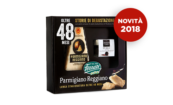 È il caso del Parmigiano Reggiano oltre 48 mesi che Ferrari Formaggi ha incluso nella sua nuova confezione di Natale Storie di degustazione. La lunga stagionatura ha affinato questo formaggio rendendolo unico per sapore e qualità della pasta. Un prodotto così pregiato è in abbinamento a un'altra eccellenza della tradizione italiana, l'aceto balsamico di Modena IGP racchiuso in morbide perle da Antichi Colli.