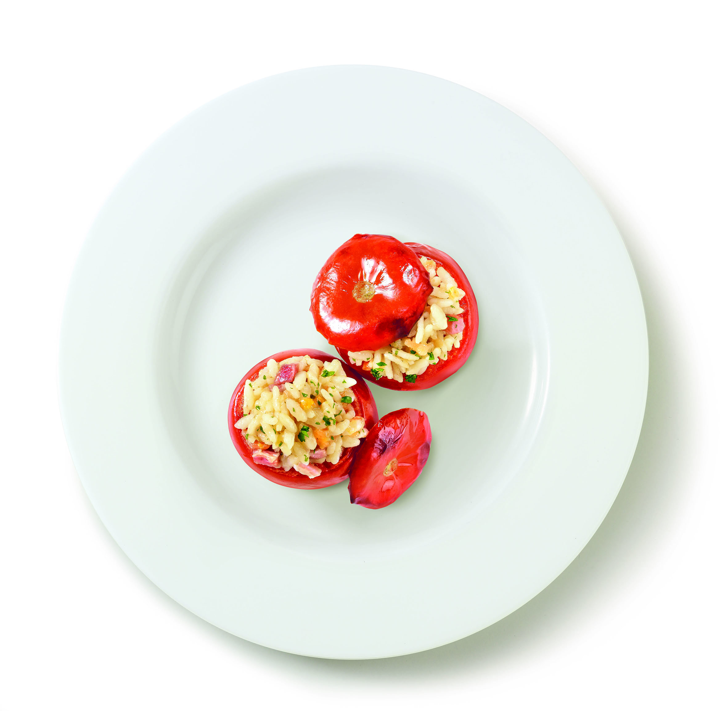 Unite il riso e lasciatelo macerare almeno per mezz’ora. Passata la mezz’ora versate nell’impasto 80gr di GranMix di Pecorino, mescolate bene e riempite i pomodori. Copriteli con il loro cappello.